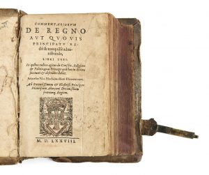[GENTILLET (Innocent)] Commentariorum de regno aut quovis principatu recte et tranquille administrando libri tres…adversus Nic. Machiavellum Florentinum. [Genève, Jacob Stoer pour Claude Juge], 1578. In-16 (12,2 x 7,5 cm), peau de truie sur ais de...