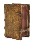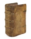 bois, décor estampé à froid sur les plats, au premier plat allégorie de la Justice et monogramme TSD avec millésime 1590 estampés à froid, scène de crucifixion au second plat, fermoirs métalliques avec lanière de cuir, dos à nerfs avec trace de titre à l’encre en tête (reliure de l’époque). [16] ff., 928 p., [14] ff. (signatures : *8 ¶8, a-z8 A-Z8 Aa-Oo8). Édition latine de ce traité politique sur le bon gouvernement. Œuvre du polémiste protestant Innocent Gentillet, il est dédié à François duc d’Alençon. Il est explicitement présenté comme une réponse à l’œuvre de Machiavel. La traduction latine est attribuée à Lambert Daneau. L’avant-propos est adressé à deux Anglais pour avertir la société elisabéthaine du danger de la pensée machiavélienne. Marque à la couronne au feuillet de titre rehaussée de couleurs. Quelques notes et soulignements à l’encre de main ancienne. Agréable exemplaire dans une reliure germanique du temps au décor estampé à froid. Bibliographie: Brunet, II, 1535. GLN, 2710. Manque de peau aux coiffes, reliure frottée, petit travail de ver en tête du dos, un fermoir manquant, gardes manquantes en tête et fin de volume, f. de titre plissé et empoussiéré, quelques rousseurs, traces d’ex-libris manuscrit ancien au f. de titre.