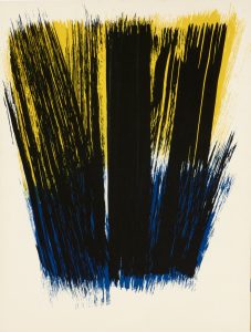 LITHOGRAPHIES ORIGINALES DE HANS HARTUNG A DOUBLE PAGE, CERTAINES EN COULEURS. Tirage à 1150 exemplaires numérotés ; l’un des 1000 signés à la justification (n° 182). Exemplaire enrichi, sur le faux-titre, d’une peinture originale en bleu et jaune, avec un envoi autographe signé au crayon de Hans Hartung au professeur Jean-Paul Binet. Bibliographie: Les lithographies sont répertoriées dans le catalogue raisonné de l’œuvre imprimé établi par Rainer Michael Mason, 305-319. Boîte salie.