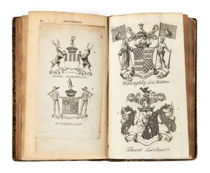 les armoiries des grandes familles anglo-saxonnes. Recueil constitué de pages d’un livre orné d’armoiries lithographiées (p. 1-93) et de 36 planches armoriées d’un ouvrage du XVIIIe s. et abondamment augmenté de 47 armoiries gravées sur métal du XIXe siècle collées sur les pages d’un autre ouvrage, le tout relié en 1 volume. Sont par ailleurs ajoutés : - au début de l’ouvrage, armoiries gravées sur cuivre aquarellées, armoiries chromolithographiées et page de titre portant des armoiries, 2 portraits gravés sur aciers de souverains anglais. - in-fine 2 armoiries imprimées en couleurs collées, 1 f. d’un imprimé du XVIIIe portant des armoiries extraites d’ouvrages non identifiés et un grand ex-libris gravé. Bibliographie: - Dubour d’Argicourt (ex-libris armorié). - Timbre sec d’armoiries collé au contreplat. - Paul Fauchereau, librairie, Auxerre (ex-libris gravé). Petits frottements sur la reliure, coins émoussés, quelques rousseurs, papier parfois bruni.