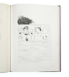 L’AQUATINTE HORS TEXTE DE DAVID HOCKNEY. Tirage limité à 500 exemplaires numérotés, celui-ci un des exemplaires du tirage B, le n° 282, signé par l’artiste. Les poèmes sont dans la traduction anglaise de Nikos Stangos et Stephen Spender. Coins un peu gauchis, petites taches légères au premier plat, petits défauts à l’étui, quelques rousseurs en marge de la 1ère aquatinte.