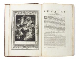 pièce de titre en maroquin vieux-rouge, doublures et gardes de papier décoré (reliure de l’époque). [4] ff. 152 p. [2] ff. ÉDITION ILLUSTREE DE 60 GRAVURES SUR CUIVRE DE BERNARD PICART D’APRES LES COMPOSITIONS D’ABRAHAM VAN DIEPENBEEK. Belle iconographie réorchestrant la mythologie gréco-romaine, en se fondant essentiellement sur Ovide. Impression soignée, agrémentée de culs-de-lampe et lettres ornées. Bibliographie: Cohen, 531 (pour l’édition de 1733). Plats, coins et dos frottés, coiffe arasée, tache en pied du premier plat, quelques épidermures, un cahier détaché au début du volume, des rousseurs et quelques salissures en marge, quelques ff. jaunis.