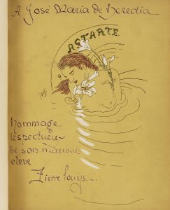 du premier livre de Pierre Louÿs, paru à compte d’auteur. COUVERTURE ILLUSTREE D’UNE BELLE COMPOSITION D’ALBERT BESNARD. Tirage limité à 100 exemplaires, l’un des 9 exemplaires sur papier Watman (n° 5), deuxième papier après 4 sur papier de Chine. Exemplaire enrichi d’un envoi autographe signé de Pierre Louÿs à José-Maria de Heredia : « Hommage respectueux de son mauvais élève ». Provenance: José-Maria de Heredia (envoi autographe signé). Très légers frottements à la reliure, quelques taches, petite déchirure à l’angle inférieur gauche de la couverture, infimes décharges d’encre de l’envoi autographe au dos de la couverture, coins de l’étui frottés.