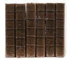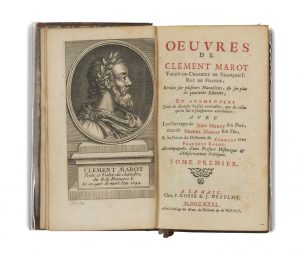 titre-auteur, vieux-rouge pour la tomaison (reliure de l’époque). XXIV p., 406 p., [1] f. ; XVI p., 428 p. ; XXIV p., 389 p. ; VIII p., 387 p. ; VIII p., 368 p. ; XXIV, 392 p. Élégante édition accompagnée d’une préface de Lenglet du Fresnoy, maître d’œuvre de cette publication. Les Œuvres de Clément Marot sont accompagnées de celles de Jean et Michel Marot et les pièces de la querelle Marot-Sagon y figurent également. « L’édition en 6 vol. in-12 donnée en même temps que celle-ci [l’édition in-4] est plus commode et plus jolie » (Brunet). JOINT Un billet volant du temps, in-12 (11,8 x 6,8 cm), contenant une brève liste de livres, parmi lesquels notre exemplaire de Marot. Provenance: - Ch. F. - Jacques Eisenmann (ex-libris). Bibliographie: Brunet, III, 1458. Des frottements aux reliures, plats, dos et coins, charnières fragilisées sur certains volumes, plusieurs coiffes arasées, quelques rousseurs éparses, petit manque angulaire au t. 2, p. XI, étiquette d’un marchand XVIIIe frottée au t. 1 et ex-libris de Ch. F. gratté au t. 6, traces d’adhésif sur les doublures.