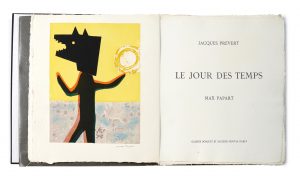 de Prévert. ILLUSTREE DE 11 GRAVURES ORIGINALES AU CARBORUNDUM SIGNEES DE MAX PAPART, DONT 10 HORS TEXTE, CERTAINES AVEC COLLAGES ET GAUFRAGES. LA COUVERTURE EST ILLUSTREE D’UNE COMPOSITION EN DEUX TONS AVEC GAUFRAGE. Tirage limité à 145 exemplaires numérotés, tous sur papier à la cuve du Moulin de Larroque et signés par l’auteur et l’artiste, celui-ci un des 100 exemplaires (n° 93), accompagné d’une gravure non utilisée, signée, qui s’ajoute à la suite de 11 gravures. Bibliographie: Monod, 9291. Infimes rousseurs éparses, mouillure à l’étui.