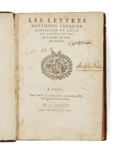 PASQUIER (Étienne) Les Lettres […]. Paris, Abel L’Angelier, 1586. In-4 (24,2 x 16 cm), basane marbrée, roulette dorée en encadrement sur les plats, dos à nerfs orné de filets dorés avec pièce de titre en maroquin rouge (reliure du début...