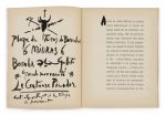 rouges poussées sur le premier plat, attaches en tissu rouge. [24] ff., 1 f. bl., [1] f. Édition originale de la traduction française de ce recueil d’un ami de jeunesse de Picasso. ILLUSTREE DE 4 POINTES SECHES ORIGINALES DE PICASSO. Tirage limité à 250 exemplaires sur papier vélin de Lana, celui-ci un des 230 numérotés (n° 138). Cette traduction fut suscitée par le succès de l’édition espagnole : Picasso réalisa de nouvelles illustrations. Il ne les grava qu’en février 1948 à Golfe-Juan. Les lettrines, les pages liminaires, la couverture, les divers titres ont également été dessinés de sa main. Belle illustration sur le thème du faune et du centaure. Bibliographie: Monod, 9670. Goeppert-Cramer, Pablo Picasso, livres illustrés, n° 45. Couverture très brunie, comme de coutume, par les plats de bois.