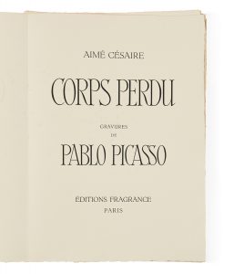 PICASSO.– CÉSAIRE (Aimé) Corps perdu. Paris, Éditions Fragrance, 1950. In-folio (39,1 x 28,2 cm), en feuilles, couverture rempliée illustrée, chemise en carton recouvert de papier vergé orange sur les plats et de parchemin imprimé sur le...