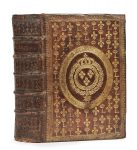 L couronnés, de fleurs de lis et de caissons dorés avec nom de l’auteur, tranches dorées (reliure de l’époque). [26] ff., 1557 p., [61] ff., 1 f. bl. Troisième édition latine du théâtre de Plaute avec les commentaires de Friedrich Taubmann. « Le commentaire de Taubmann a mérité et obtenu l’approbation des savants » (Brunet). L’édition s’appuie sur le travail philologique de Janus Gruter qui a collationné l’important manuscrit palatin de la bibliothèque de Heidelberg. Texte sur deux colonnes. Exemplaire aux armes de Louis XIV. Bibliographie: Brunet, IV. Ebert, Allgemeines bibliographisches Lexikon, II, 17195. OHR, pl. 2494, fer n° 7). Coiffe supérieure et coins maladroitement restaurés, frottements au dos et dorure passée, coiffe inférieure arasée, petite brûlure sur les armes au premier plat, plat inférieur frotté, exemplaire intégralement bruni, petits travaux de vers en marge des derniers ff.