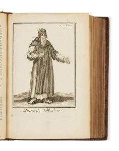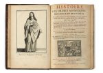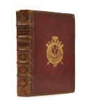 rouge, triple filet doré encadrant les plats avec armes dorées au centre, dos à nerfs orné de fleurons et feuillages dorés, titre et tomaison, tranches dorées, dentelle intérieure dorée (reliure de l’époque). XCVIII p., [3] ff., 399 p., [12] ff. Édition originale. ILLUSTREE DE 102 PLANCHES DE COSTUMES RELIGIEUX GRAVEES SUR BOIS PAR GIFFART, DUFLOS, THOMASSIN ET POILLY. Tome 1 seul. Exemplaire aux armes de Voisin de la Noraye, chancelier de France et garde des sceaux en 1714. Provenance: Daniel-François Voysin de la Noraye (armes). Bibliographie: Cohen, 480. OHR, 1339, mais un autre fer non répertorié. Tome 1 seul sur 8, reliure frottée, des défauts sur les plats, les coins et le dos, petit travail de ver en tête des ff. à partir de la p. 9, plusieurs cahiers jaunis.
