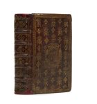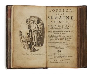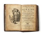 les plats avec armoiries dorées au centre sur un semis de fleurs-de-lis et de chiffres couronnés « MT » dorés, dos à nerfs, caissons avec chiffre couronné « MT » doré aux entrenerfs, tranches dorées, roulette intérieure, doublures et gardes de papier marbré (reliure de l’époque). [2] ff., 836 p. Édition de l’Office de la Semaine Sainte dans la traduction de Michel de Marolles et avec les commentaires du Franciscain Daniel de Cigogné. FRONTISPICE, 3 PLANCHES HORS TEXTE PAR PICART ET 4 COMPOSITIONS A PLEINE PAGE DANS LE TEXTE. Impression bilingue français-latin sur 2 colonnes. Exemplaire entièrement réglé, aux armes de Marie-Thérèse d’Autriche (1638-1683), épouse de Louis XIV (OHR, planche n° 2506, fer n° 1, pour les armes, et petit format sans les palmes du fer n° 4 de la même planche, pour les chiffres). Provenance: - Marie-Thérèse d’Autriche (chiffres et armes). - Vente Beaussant-Lefèvre, 5 février 2003, n° 67. Frottements sur les reliures, coins frottés, restaurations maladroites aux coiffes, et mors, traces de fermoirs, quelques traces de mouillure en pied des ff. et affectant les planches, des rousseurs et des cahiers brunis.