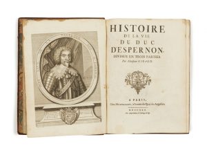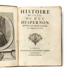 [RELIURE AUX ARMES].– GIRARD (Guillaume) Histoire de la vie du duc d’Espernon, divisée en trois parties. Paris, Montalant, 1730. In-4 (26,2 x 19 cm), veau granité, filet doré encadrant les plats, armes au centre des plats, fleurs de lis...