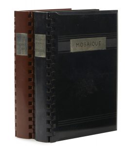 plaque métallique incrustée, cadre intérieur en relief, contreplats et gardes de papier décoré, tête dorée, premiers plats de couverture (Reliure Jotau - Breveté S.G.D.G.). Exemplaire sur papier vélin du Marais (n° 1765). JOINT - MÉRIMÉE (Prosper). Mosaïque. Paris, Calmann-Lévy, 1928. In-12 (19,3 x 13,5 cm), résine moulée noire, plats biseautés, sur le premier plaque métallique incrustée portant le titre, charnières articulées, dos lisse avec plaque métallique incrustée, cadre intérieur en relief, contreplats et gardes de papier décoré, tête dorée, premiers plats de couverture (Reliure Jotau - Breveté S.G.D.G.). Exemplaire sur papier vélin du Marais (n° 1474). Bel ensemble de ces spécimens de reliure JOTAU qu’il est difficile de trouver sans éclats ou cassures. Quelques rayures aux plats. 1. Quelques petites salissures au fond de certains cahiers. Reliure légèrement gauchie.