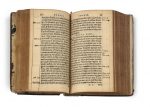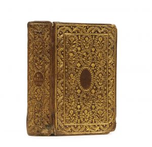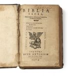 dorées avec ovale en réserve au centre, dos lisse orné du même décor avec titre et tomaison dans un ovale, tranches dorées (reliure de l’époque). [16] ff., 726 p. (signatures : *-**, 8a-z8, A-Z8). Premier volume seul de cette bible latine lyonnaise. Il comprend le Pentateuque, le Livre de Josué, le Livre des Juges et le Livre de Ruth. Exemplaire entièrement réglé. Belle reliure à décor attribuable à l’atelier des Ève, très proche de certaines reliures pour l’ambassadeur Duodo de la collection Esmerian. Provenance: Daigneux ( ?) (ex-libris manuscrit). Bibliographie: USTC, n° 139869. Bibliothèque Esmerian, I, n° 59-61. Un volume sur 5, reliure frottée aux coins et au dos, trois mors fendus, manque en pied du dos, quelques travaux de ver et importante tache noire au plat inférieur, première garde manquante, page de titre empoussiérée avec quelques défauts, petits défauts de papier en marge des p. 35-38, petite mouillure claire en tête de quelques ff.