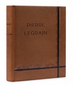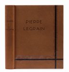 rejoignant en pied du premier plat avec décor mosaïqué d’éventails au pointillé et motif dentelé, dos lisse, doublures de daim châtaigne, tête dorée, couvertures et dos conservés, étui (J.–P. Laurenchet). XLVIII p., [1] f., 204 p., [1] f. Important ouvrage sur l’œuvre du relieur Pierre Legrain. ILLUSTRE DE 250 REPRODUCTIONS EN HELIOGRAVURE, DONT 7 EN COULEURS. Tirage limité à 620 exemplaires numérotés sur vélin de Rives BFK, celui-ci un des 100 premiers, réservés aux membres de la Société de la reliure originale (n° XV). La première partie présente des études de spécialistes de la reliure, largement illustrés. La seconde partie comprend un répertoire descriptif et bibliographique de 1236 reliures. Bel exemplaire en maroquin havane. Dos légèrement éclairci avec petits frottements, quelques traces blanches sur les plats.