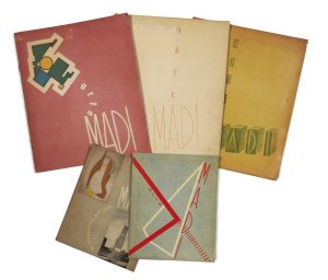 [REVUE].– [KOSICE (Gyula)] Arte madi universal. Buenos Aires, 1948-1952 [oct. 1948 (n° 2), oct. 1949 (n° 3) oct. 1950 (n° 4) oct. 1951 (n° 5) et oct. 1952 (n° 6)]. 2 fascicules in-8 (23 x 18,7 cm) et 3 fascicules in-4 (31 x 25,8 cm), brochés,...