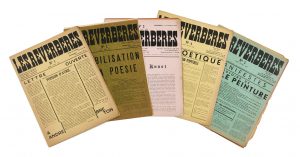 [REVUE] Les Réverbères. Paris, avril 1938-juillet 1939. 5 fascicules in-4 (32,5 x 25 cm env.), en ff. Réunion des 5 premiers, et seuls, numéros de la revue néo-dadaïste Les Réverbères, dirigée par Pierre Minne. Le n° 1 est ORNE D’UN...