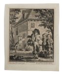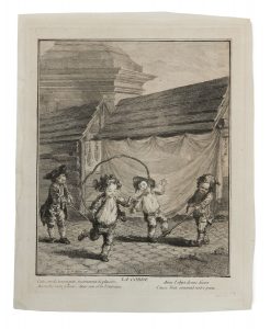 représentent différents jeux auxquels s’adonnaient les jeunes enfants à Paris à la fin du XVIIIe siècle : le sabot, le coupe-tête, la fossette ou le jeu de noyaux, la toupie et la corde. La dernière planche figure la sortie du collège où l’on voit des enfants sauter, courir, danser. Cette série fut publiée vers 1770 : la planche intitulée « La fossette ou le jeu de noyaux » présente cette date gravée à côté du nom de l’artiste. Le tirage original est rarissime. Exemplaire en tirage postérieur, certainement du XIXe siècle. Les planches ont été significativement recoupées. Bel ensemble. Bibliographie: Cohen, 923. Bocher, Catalogue de l’œuvre d’A. de Saint-Aubin, V, n° 396-401. Le frontispice est affecté de plusieurs manques, reprise à l’encre au titre, hachures ajoutées, « La corde » présente également des manques, planche de « La toupie » brunie au dos et avec petites brunissures marginales, petites bandes de papier du Japon en marge gauche de « La corde ».