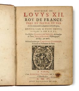 SEYSSEL (Claude), AUTHON (Jean d’) et GODEFROY (Théodore) Histoire de Louys XII, roy de France […] et des choses mémorables advenues de son Règne, depuis l’an MCCCCXCVIII, jusqu’à l’an MDXV. Paris, Abraham Pacard, 1615. In-4 (23 x 16,8...