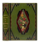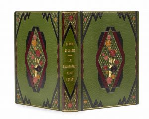SOULAGES (Gabriel) Le Malheureux petit voyage. Paris, L’Estampe moderne, 1926. In-8 (21,4 x 16,2 cm), maroquin vert, plats et dos ornés d’un motif floral mosaïqué répété aux angles, encadrement losangé de bandes de maroquin bordeaux et...