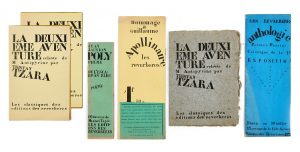 été présentée le 26 mai 1920 au Festival Dada de la salle Gaveau. Tirage limité à 125 exemplaires numérotés, n° 93 sur papier vergé Lafuma. JOINTS - 2 prospectus pour cet ouvrage, orné chacun d’une illustration de Pierre Minne. - JAUSION (Jean). Polyphème, ou l’Escadron bleu. Paris, les Éditions des Réverbères, 1939. Plaquette in-8 très étroit (25,5 x 7 cm), broché, imprimé sur papiers colorés. ORNE DE 10 DESSINS REPRODUITS DE MICHEL TAPIE. Tirage à 225 exemplaires numérotés (n° 86). - Hommage à Guillaume Apollinaire. [Paris], Les réverbères, [1938]. Plaquette in-8 étroit (32,5 x 12,5 cm), une feuille pliée en 4, avec papillons de papier vert collés. Prospectus sur papier vert pour la Chanson du mal aimé de Madeleine Milhaud, joint. - LES RÉVERBÈRES. Anthologie. Poèmes, dessins. Catalogue de la 1ère exposition. Paris, Les Réverbères, 1938. Plaquette in-8 étroite (32,5 x 12,5 cm) de 32 p., imprimée sur papier bleu et jaune. - LE CHERCHE-MIDI. Numéros 1 et 2. Paris, Montbrun, 1946-1947. In-4 (24 x 31,5 cm) en une grande feuille pliée en 4. Le n° 1 est ORNE D’UNE PHOTOGRAPHIE REPRODUITE ET D’UNE LITHOGRAPHIE DE MAREMBERT. Tirage à 362 exemplaires numérotés ; l’un des 325 sur Ingres blanc (n° 124). Le n° 2 est orné d’une lithographie de Carzou. Tirage à 382 exemplaires numérotés ; exemplaire du service de presse sur papier vergé antique. Bon de souscription joint. Sur la couverture poème autographe signé de Jean Marembert, au crayon. 1. Quelques rares rousseurs et petites décharges. 3. Papier très légèrement bruni par endroits. 5. Couverture partiellement insolée, petit manque en pied. 6. Quelques rousseurs ; papier du n° 2 bruni.
