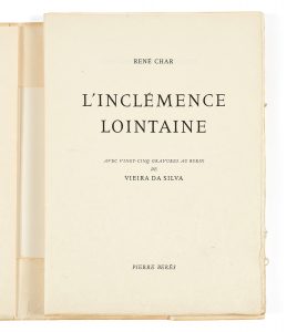 VIEIRA DA SILVA.–CHAR (René) L’Inclémence lointaine. [Paris], Pierre Bérès, [1961]. Grand in-folio (46,5 x 34 cm), en feuilles, couverture rempliée, chemise et étui de l’éditeur.2 ff. bl. 122 p., [2] ff., 2 ff. bl. Édition en partie...