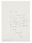 originale, avec les poèmes « Si » et « Pour un Prométhée saxifrage » en première édition. ILLUSTREE DE 25 GRAVURES AU BURIN A PLEINE PAGE DE MARIA HELENA VIEIRA DA SILVA. Tirage limité à 130 exemplaires, tous sur papier du Japon et signés par l’auteur et l’artiste, celui-ci un des 110 numérotés sans suite (n° 96). Exemplaire enrichi d’une LAS volante de Maria Helena Vieira da Silva à [Pierre Boulez] datée de Paris, 11 janvier 1992. 1 p. sur 1 f. in-4 (29,7 x 21 cm). La lettre semble correspondre à un don par l’artiste de notre exemplaire de l’ouvrage, « en témoignage d’amitié », pour s’associer à un hommage rendu à Pierre Boulez par le Centre Pompidou. Le poème « Le Permissionnaire » comporte des variantes. JOINT 1 carte autographe signée de M. H. Vieira da Silva à un destinataire pour lequel elle a réalisé le décor d’une pochette. 1 p. sur 1 bifeuillet in-12 (16,3 x 14,8 cm). «Merci pour votre Pli selon Pli (…). J’espère que la pochette de Rituel et Éclats ne vous décevra pas trop. J’ai fait ce que j’ai pu pour qu’elle soit le moins mal possible. » Dessin en couleurs de sa main reproduit par le procédé Jacomet au premier plat de la carte. Provenance: Pierre Boulez. Bibliographie: P.–A. Benoit, Bibliographie René Char, n° 104. Chapon, Le Peintre et le livre, Flammarion, 1987, p. 166. Couverture très brunie, feuillets légèrement brunis en pied, quelques frottements et petites taches à l’étui.