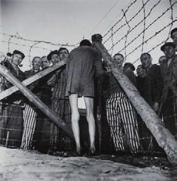 Margaret Bourke-White 1904-1971 Group of prisoners from all nations, On this side of fence one the sick prisoners, Buchenwald, 1945.