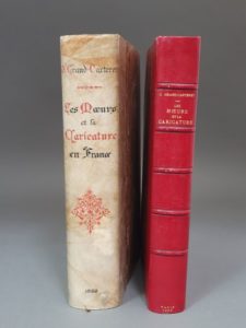 GRAND-CARTERET. Ensemble 2 ouvrages sur la caricature. - Les Mœurs de la caricature en France. Paris, Librairie illustrée, s.d. [1888]. In-4, demi-vélin marbré, dos lisse portant le titre calligraphié en noir et rouge et orné d un fleuron peint en rouge, tête dorée, non rogné, couverture (A. Lambert). - Les Mœurs de la caricature en Allemagne, en Autriche, en Suisse. Paris, Louis Westhausser, 1885. Grand in-8, demi-chagrin rouge avec coins, tête dorée, non rogné, couverture (Reliure de l époque). Deuxième édition. Rousseurs claires.