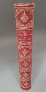 MANTZ (Paul). Les Chefs-d œuvre de la peinture italienne. Paris, Firmin Didot frères, fils et Cie, 1870. In-folio, chagrin rouge, triple filet doré, dos orné, dentelle intérieure, tête dorée, non rogné (Petit succr de Simier). 20 planches en chromolithographie exécutées par F. Kellerhoven, 30 planches sur bois et 40 culs-de-lampe et lettres ornées. Quelques frottements à la reliure, sinon très joli exemplaire.