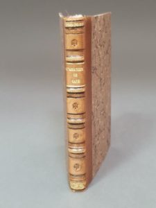 [MARTIN]. Manuel de l amateur de café, ou l art de prendre toujours de bon café. Paris, Audot, 1828. In-12, basane fauve, dos orné, non rogné, couverture (Reliure pastiche moderne). Frontispice lithographié par Henry Monnier, colorié. Auréole de mouillure tout au long du volume.