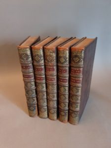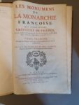 MONTFAUCON (Bernard de). Monuments de la monarchie française. Paris, Gandouin, Giffart, 1729-1733. 5 volumes in-folio, veau granité, dos orné, pièces de titre et de tomaison rouges, tranches mouchetées de rouge (Reliure de l époque). Édition originale. Frontispice (portrait équestre de Louis XV) et 306 belles figures hors texte. Portrait de l auteur ajouté. Restaurations à des mors et coiffes.