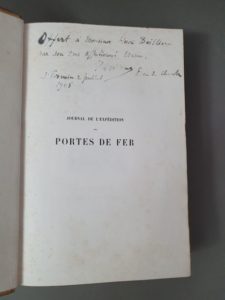 NODIER (Charles). Journal de l expédition des Portes de Fer. Paris, Imprimerie royale, 1844. Grand in-8, bradel papier chamois, pièce de titre brune au dos, non rogné (Cartonnage de l éditeur). Édition originale, tirée sur papier vélin. Premier tirage des 40 figures hors texte gravées sur bois et tirées sur chine monté, et des nombreuses vignettes dans le texte. Une carte dépliante placée à la fin du volume. EXEMPLAIRE DE PRESENT OFFERT PAR LE DUC DE CHARTRES, fils cadet du duc d Orléans, au libraire-éditeur Henri Baillière avec envoi manuscrit daté 1905. Des rousseurs, comme presque toujours sur ce volume. Quelques frottements.