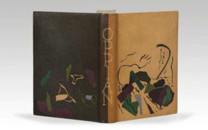 OPPIAN. Cynégétique. Paris, Société des Cent une, 1955. In-4, maroquin à gros grain, bicolore (brun et fauve), composition de pièces mosaïquées de diverses couleurs sur les plats, dos lisse orné du titre doré à la chinoise, doublure du contreplat supérieur et première garde de papier japon orné de compositions originales de feuilles séchées collées avec rehauts de peinture, tranches dorées sur témoins, couverture et dos, étui (Lucienne Thalheimer). 31 gravures originales dans le texte et 4 planches sur japon, le tout gravé par Pierre-Yves Trémois. Tirage à 140 exemplaires sur grand vélin d Arches. RELIURE MOSAÏQUEE DE LUCIENNE THALHEIMER (1904-1988), relieuse d art qui travailla beaucoup avec les Surréalistes.
