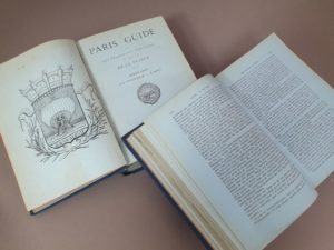 PARIS GUIDE par les principaux écrivains et artistes de la France. Paris, Librairie internationale, Lacroix, Verboeckhoven et Cie, 1867. 2 forts volumes in-8, toile bleue (Cartonnage de l éditeur). Édition originale de cet ouvrage publié à l occasion de l Exposition universelle de Paris de 1867. L illustration, en premier tirage, comprend plus de 100 gravures sur bois d après Daubigny, Bracquemond, Eugène Lami, Célestin Nanteuil, Félicien Rops, etc., 16 planches à double page d intérieurs de théâtre, et 7 cartes et plans. TRES RARE EXEMPLAIRE TIRE SUR PAPIER BLEU. Carteret ne mentionne aucun exemplaire sur papier de couleur. Sans le grand plan dépliant de Paris. Dos foncé.