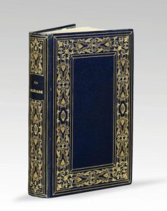 PLÉIADE (La). Ballades, fabliaux, nouvelles et légendes. Paris, L. Curmer, 1842. Petit in-8, maroquin bleu nuit à long grain, large bordure dorée, dos lisse orné, encadrement intérieur orné de fers dorés, doublure et gardes de moire bleue, tranches dorées, couverture, étui (H. Blanchetière). Très jolie publication de Léon Curmer, illustrée de 10 frontispices, d une planche hors texte et de 66 vignettes dans le texte, le tout gravé sur cuivre ou sur bois d après Adrien Féart, Penguilly, Charles Jacque, Jeanron, Trimolet et Pauquet. Premier tirage. Bel exemplaire provenant de la bibliothèque Jules Le Roy (ex-libris).