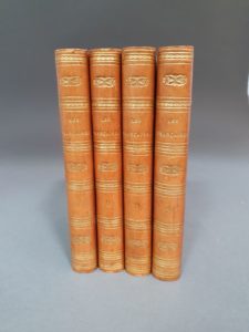 RESTIFDE LA BRETONNE (Nicolas-Edme). Les Françaises ou XXXIV Exemples choisis dans les Mœurs actuelles, Propres à diriger les Filles, les Femmes, les Epouses & les Mères. Neufchâtel, Et se trouve à Paris, Guillot, 1786. 4 volumes in-12, demi-chagrin orangé, dos lisse orné (Mercher). Édition originale, ornée de 34 figures gravées sur cuivre d après les dessins de Binet. Titre du tome IV remonté avec restauration de papier angulaire et marginale.