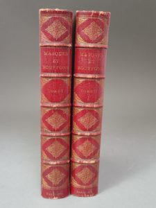 SAND (Maurice). Masques et bouffons. Comédie italienne. Paris, Michel Lévy frères, 1860. 2 volumes grand in-8, maroquin rouge, triple filet, dos orné, dentelle intérieure, tranches dorées (Hardy). Édition originale, illustrée en premier tirage d un frontispice et de 49 planches. Exemplaire avec les planches en double état, en sanguine et coloriées (certaines restées en noir). Rousseurs. Frottements à la reliure.