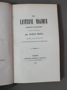 SOULIÉ (Frédéric). La Lanterne magique. Histoire de Napoléon racontée par deux soldats. Paris, Alphonse Henriot, 1838. In-8, demi-chagrin vert, dos orné (Reliure de l époque). Édition originale, ornée dans le texte de 50 vignettes sur bois de Charles Jacque. De la bibliothèque Gaston Prinet, avec ex-libris. Traces de cire blanche à la reliure.