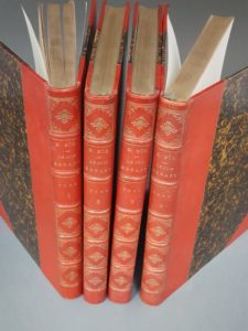 SUE (Eugène). Le Juif errant. Paris, Paulin, 1845. 4 volumes grand in-8, demi-chagrin orangé avec coins, dos orné, tête dorée, non rogné (Reliure vers 1900). Première édition illustrée, ornée de 83 planches et d environ 600 vignettes par Gavarni, en premier tirage. Une carte repliée au tome III. Très bien relié. Quelques rousseurs.