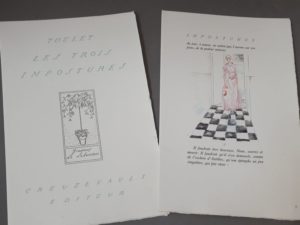 TOULET (Paul-Jean) TOULET (Paul-Jean). Les Trois impostures. Paris, Creuzevault, s.d. [1946]. In-8, en feuilles, …