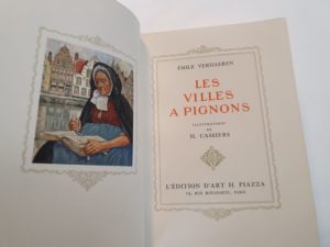VERHAEREN (Émile). Les Villes à pignons. Paris, Piazza, 1922. In-8, maroquin vert foncé, janséniste, encadrement intérieur orné d un double filet doré, tête dorée, non rogné, couverture et dos, étui (F. Aufschneider). Illustrations en couleurs de H. Cassiers. Exemplaire imprimé sur papier vélin, bien établi. De la bibliothèque A. de Groote (ex-libris).
