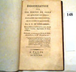 DISSERTATION sur LES PERTES de SANG qui affectent les femmes pendant la grossesse, lors et à la suite de l'accouchement, par A.E de SAINT-AMAND Maire et Médecin de l’Hôtel-Dieu de LAFERTE-GAUCHER. Paris, 1803, volume in-8, 82 pages, relié plein...