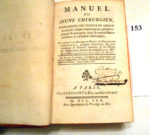 MANUEL du JEUNE CHIRURGIEN par NICOLAS, avec un précis de pharmacie chirurgicale … Paris, 1770, in-12, 645 pages, reliure pleine basane marbrée, dos à nerfs orné (défaut au dos). Bon état intérieur.