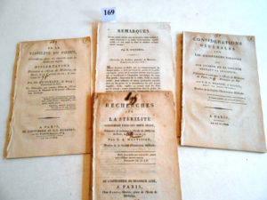 ESQUIROL – Au sujet des PENDUS (1825) 16 pages Dr MASSON d’Annecy – (1802) Naissances tardives. 52 pages Dr MESTIVIER – STERILITE. 1803, 101 pages Dr HUDELLET de Bourg. VIABILITE du FŒTUS.1803. 4 brochures