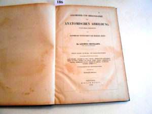 GESCHICHTE der ANATOMISCHEN ABBILDUNG. Dr Ludwig Choulant. Leipzig 1852. Volume in-4, 203 pages. Reliure toile verte. Nombreuses gravures. Rousseurs, parfois assez fortes. Ex-libris.
