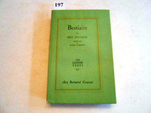 Marie DORMOY – BESTIAIRE par Paul LEAUTAUD préface de Marie DORMOY–. EDITION ORIGINALE. Bernard Grasset. 1959, Les Cahiers Verts N°55, l’un des 40 sur Montval (N°8), Non coupé, mouillure marginale. Volume in-12 broché, envoi autographe...