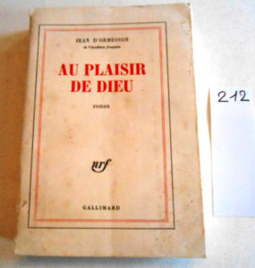 Jean d’ORMESSON – AU PLAISIR de DIEU. N.R.F 1974, (année de publication de l’Edition Originale), in-8 broché. Joignons à ce lot un ensemble d’environ 26 volumes brochés de la N.R.F (Mac Orlan, Tierry Maulnier, J. de Bourbon Busset, Marcel...
