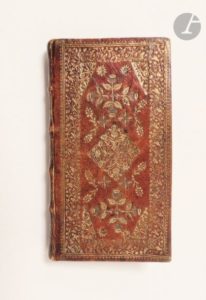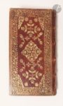 La Haye : Abraham Troyel, 1691. — In-12, maroquin rouge, plats ornés d'un encadrement composé de filets dorés et d'une large roulette à motifs de pampres et d'oiseaux, motif de volutes dorées aux angles, composition centrale faite d'une répétition de fers de fleurs et de chardons disposés en croix symétriquement, associés à des soleils aux extrémités et d'autres motifs de fleurs entre deux, dos à nerfs orné (reliure de l'époque).