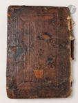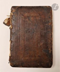La reliure est malheureusement délabrée, présentant de nombreux manques. Le dos est presque totalement absent, le second plat est défait. Il manque le premier feuillet contenant le titre en rouge et noir ; les feuillets D2 à D5 sont déreliés et le dernier a été collé sur le second contreplat, il présente des déchirures. Les parties non collées de ce dernier feuillet, laissent apparaître au verso de nombreuses annotations manuscrites anciennes. Mouillures et trous de vers sans gravité.